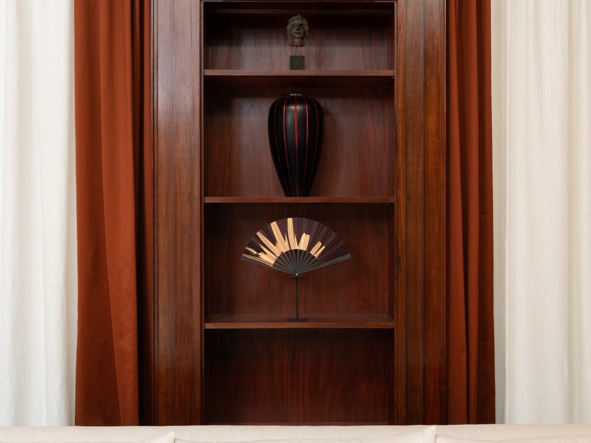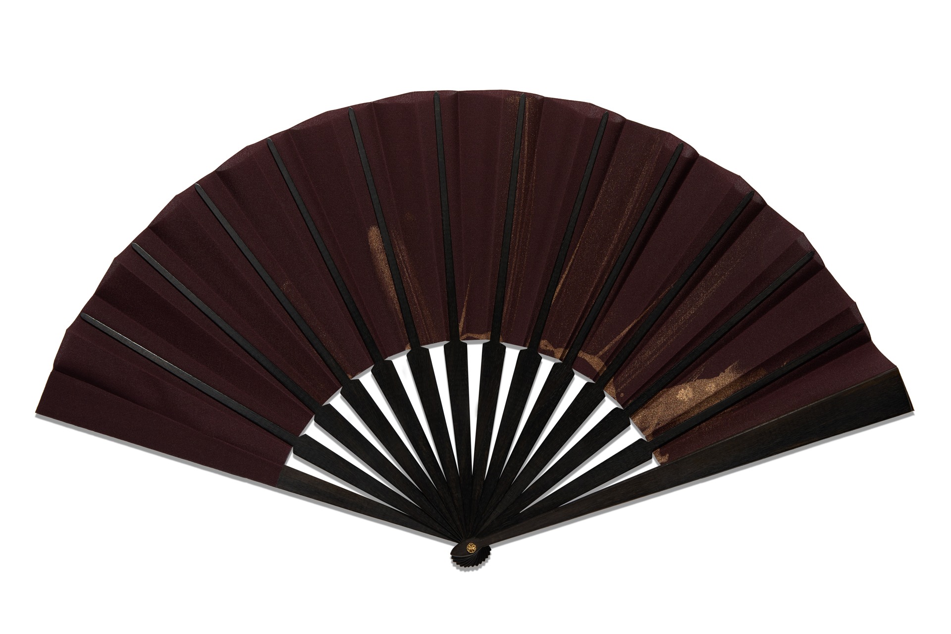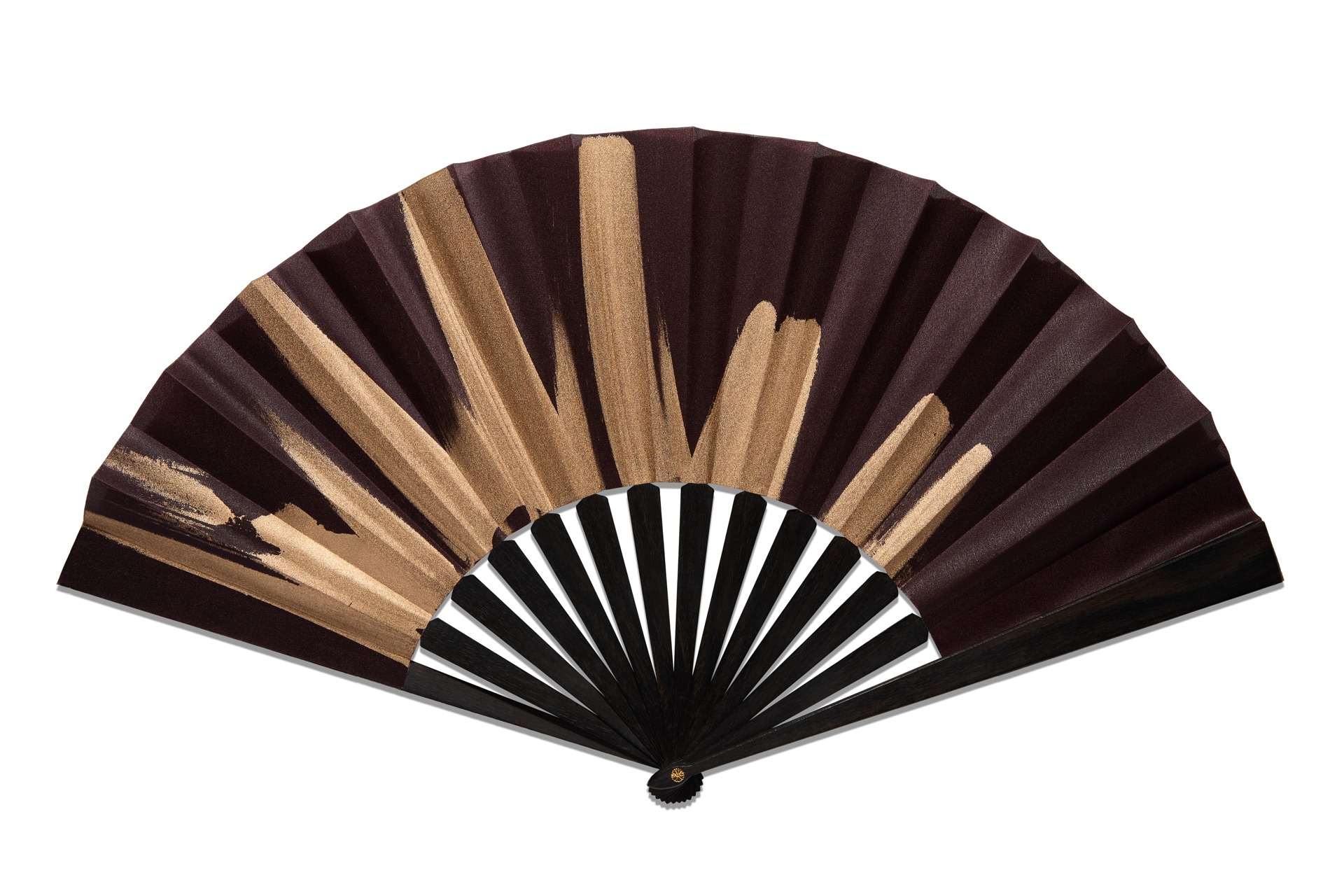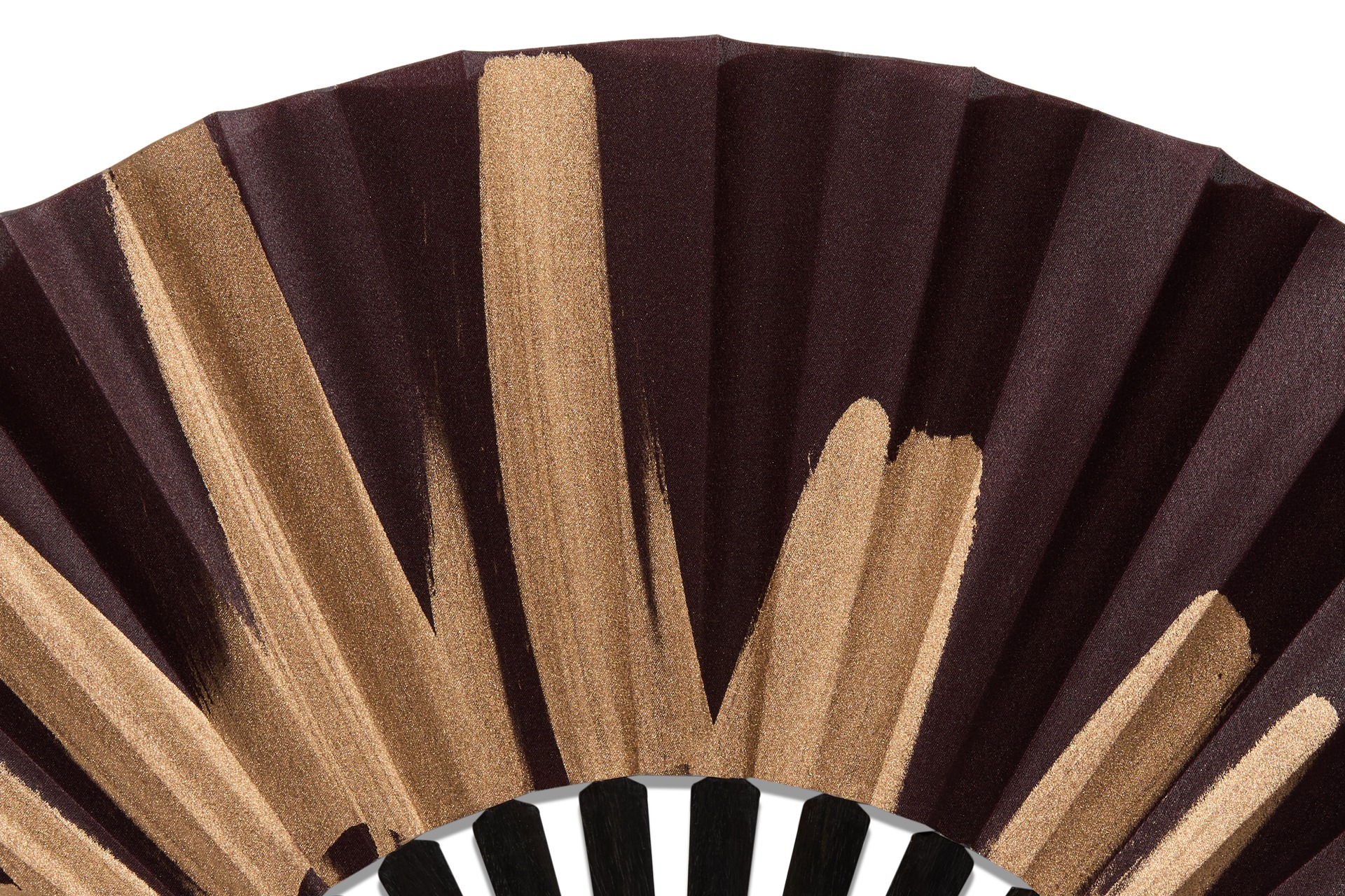 Ebène provenant d’Afrique centrale, mis en forme par un tabletier en Espagne. Soie. Hauteur de l’éventail 23cm. Amplitude 47cm.