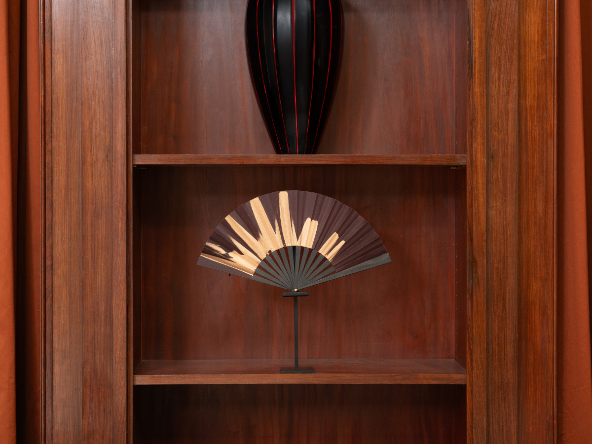 Pour ce modèle, le maître éventailliste réalise une peinture unique sur chaque feuille de soie prune.