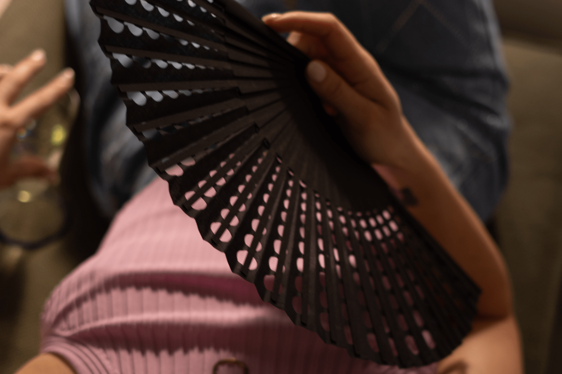 Interprétation contemporaine des « Madame sans gêne », ces éventails faits pour voir sans être vus au XIXème siècle, cette création de Sinan Sigic joue avec l’ombre et la lumière. Fondateur de l’Atelier Hapax, ce designer-artisan-artiste fait tout lui-même, du dessin à la maquette. Il a imaginé des vitrines pour les plus grandes maisons de luxe, inventé des objets en cuir et en papier et est tombé amoureux de l’éventail en découvrant Duvelleroy.