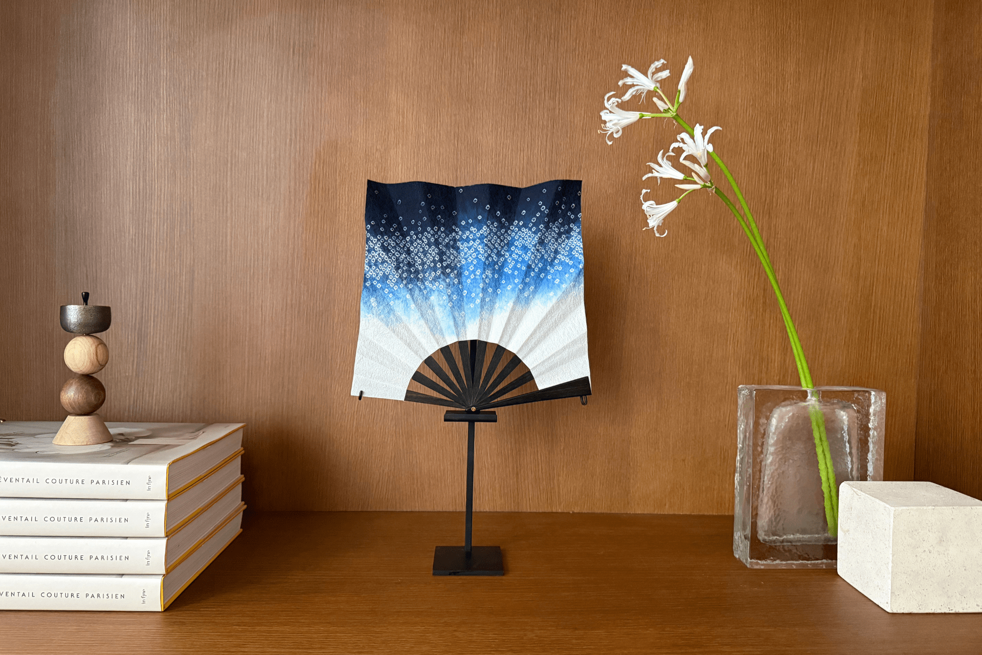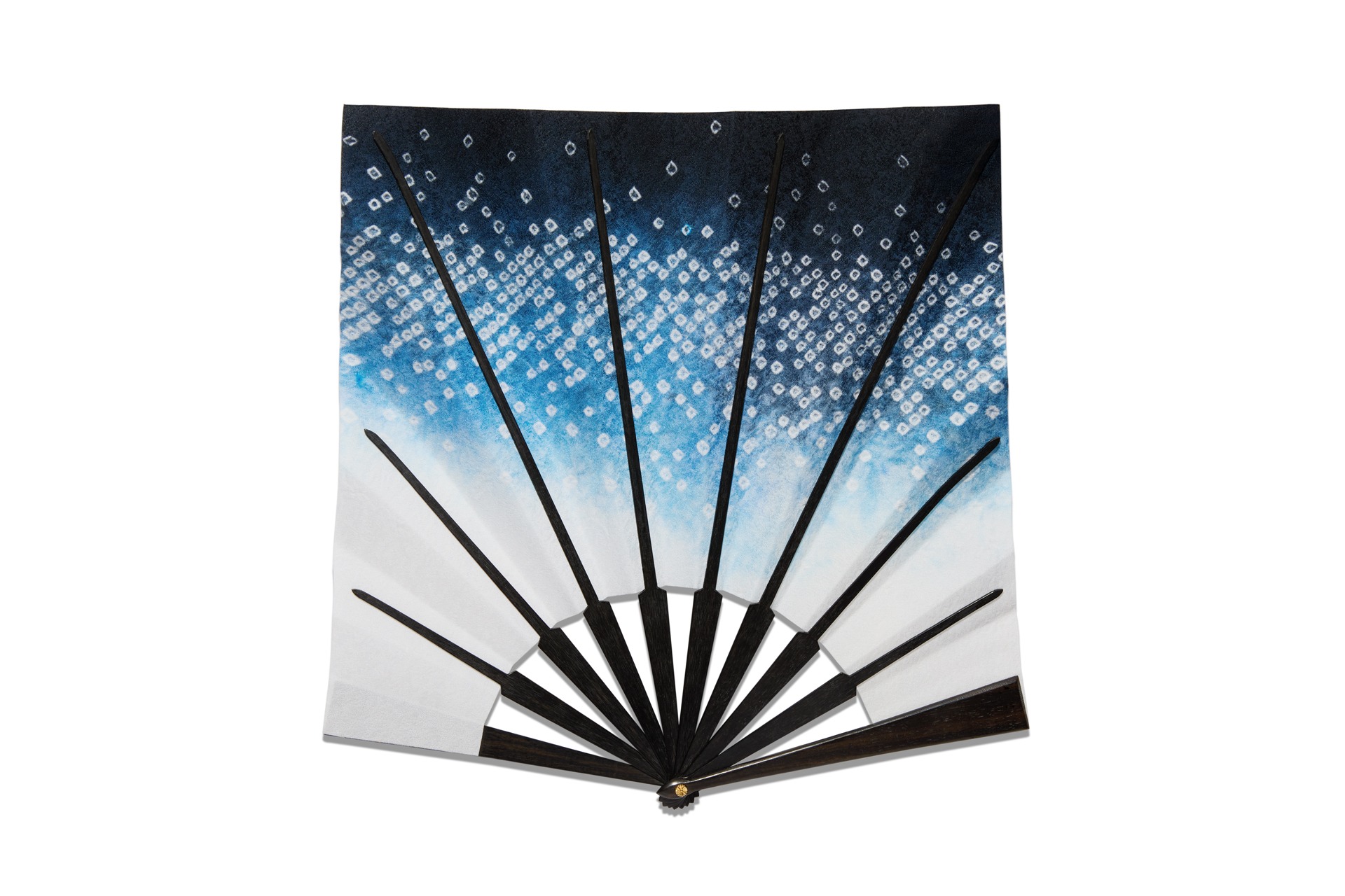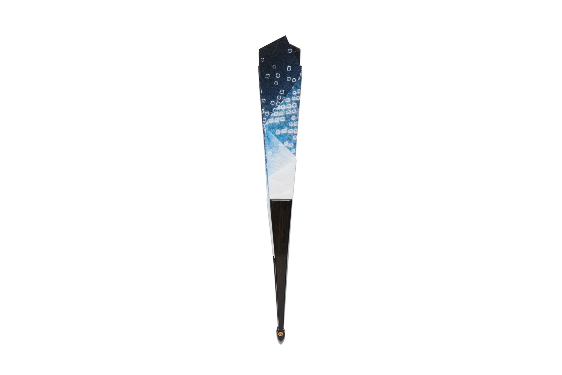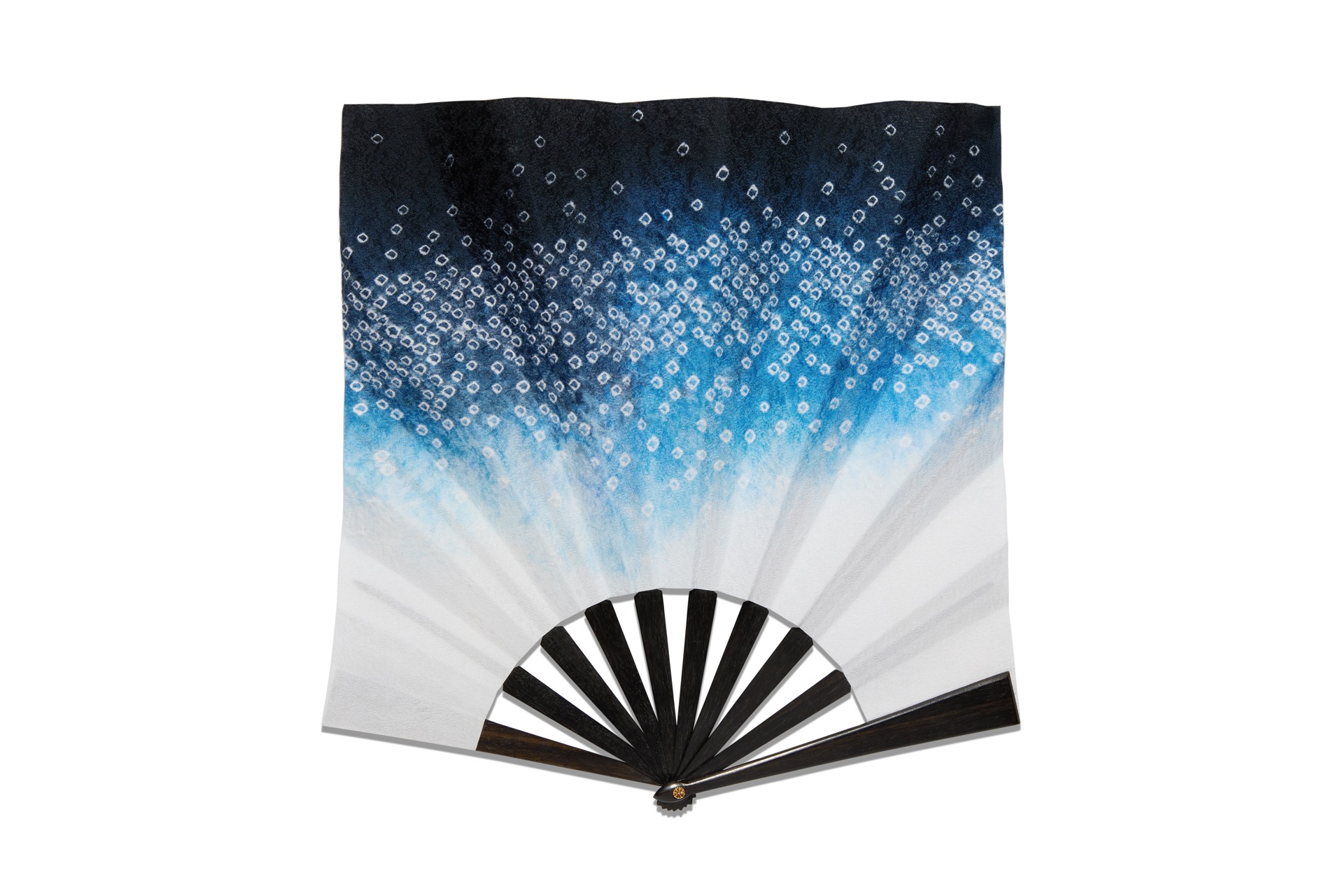 Cet éventail d’exception est passé par plusieurs étapes de fabrication. À Kyoto, le placement des motifs a d’abord été dessiné sur papier puis retranscrit sous forme de pochoir. Tandis que de minuscules nœuds ont été réalisés sur la soie aux points indiqués, les zones destinées à rester blanches ont été protégées. Trois étapes de teinture ont ensuite permis d’obtenir les fascinantes nuances de bleu du tissu.