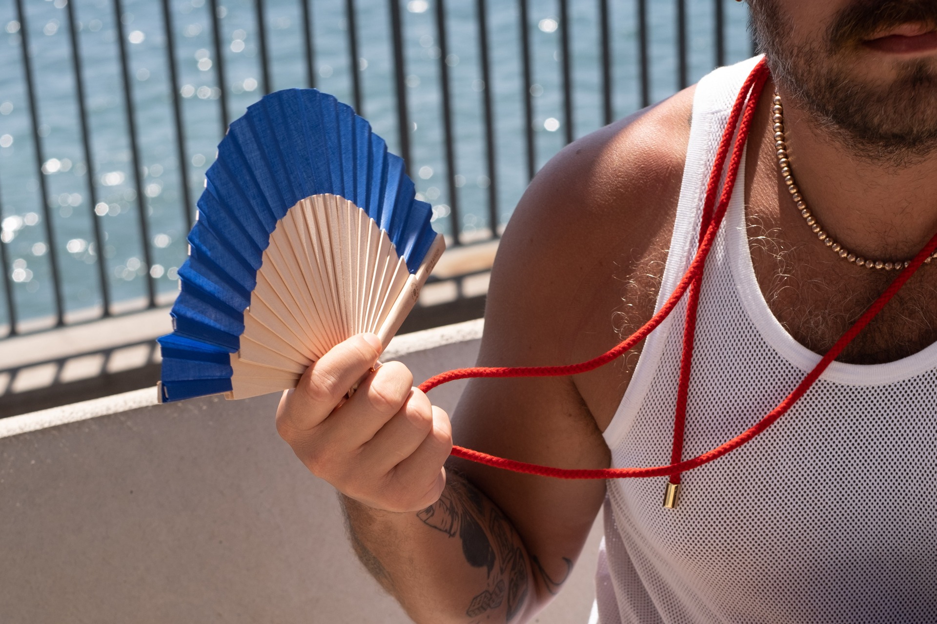 Natural sycamore wood sticks. Blue cotton cloth, stiffened, hand-pleated and assembled to the frame. Red cord, adjustable in length thanks a metal ring, clasp to release the fan.