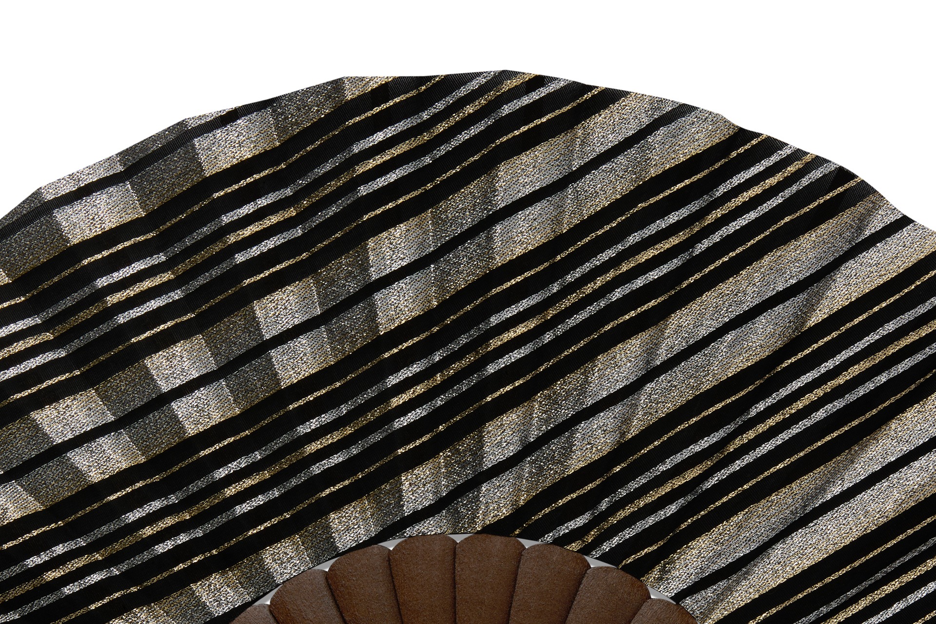The Dubai hand-fan is made in a metallic gold and silver striped organza made in Italy. With its bold graphic pattern and XXL size, it makes a striking impression on every occasion.
